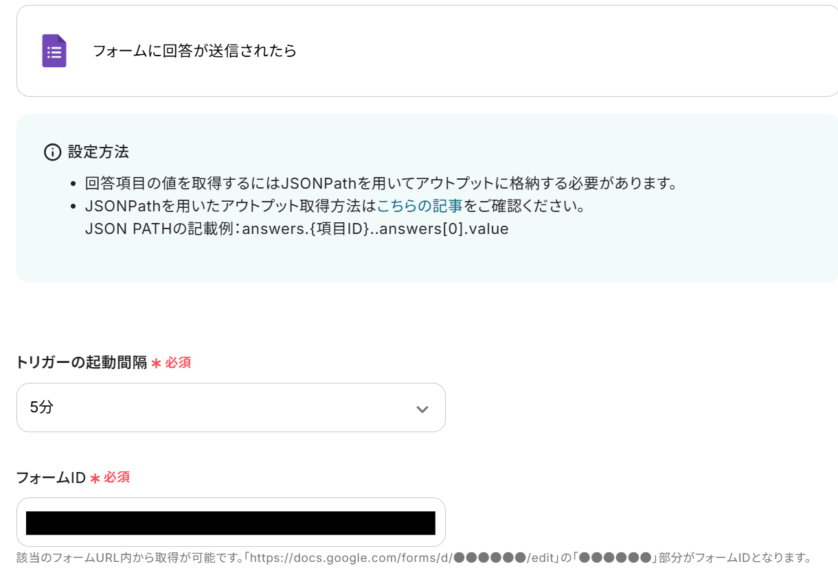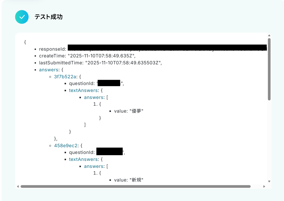 ・Googleフォームをトリガーとして使用した際の回答内容を取得する方法は下記を参照ください。https://intercom.help/yoom/ja/articles/6807133
