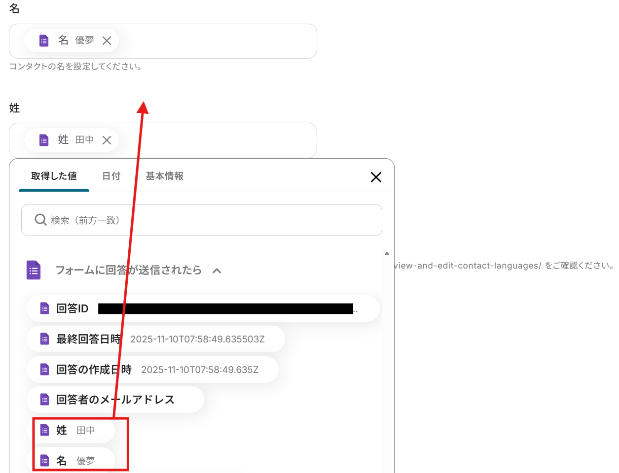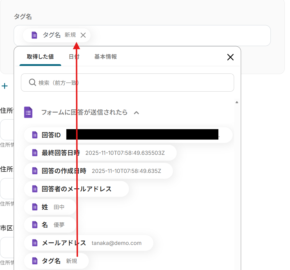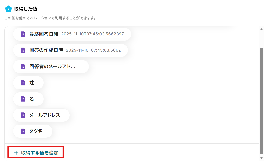 「取得する値を追加」をクリックし、下記のページを参考に回答を取得してください。