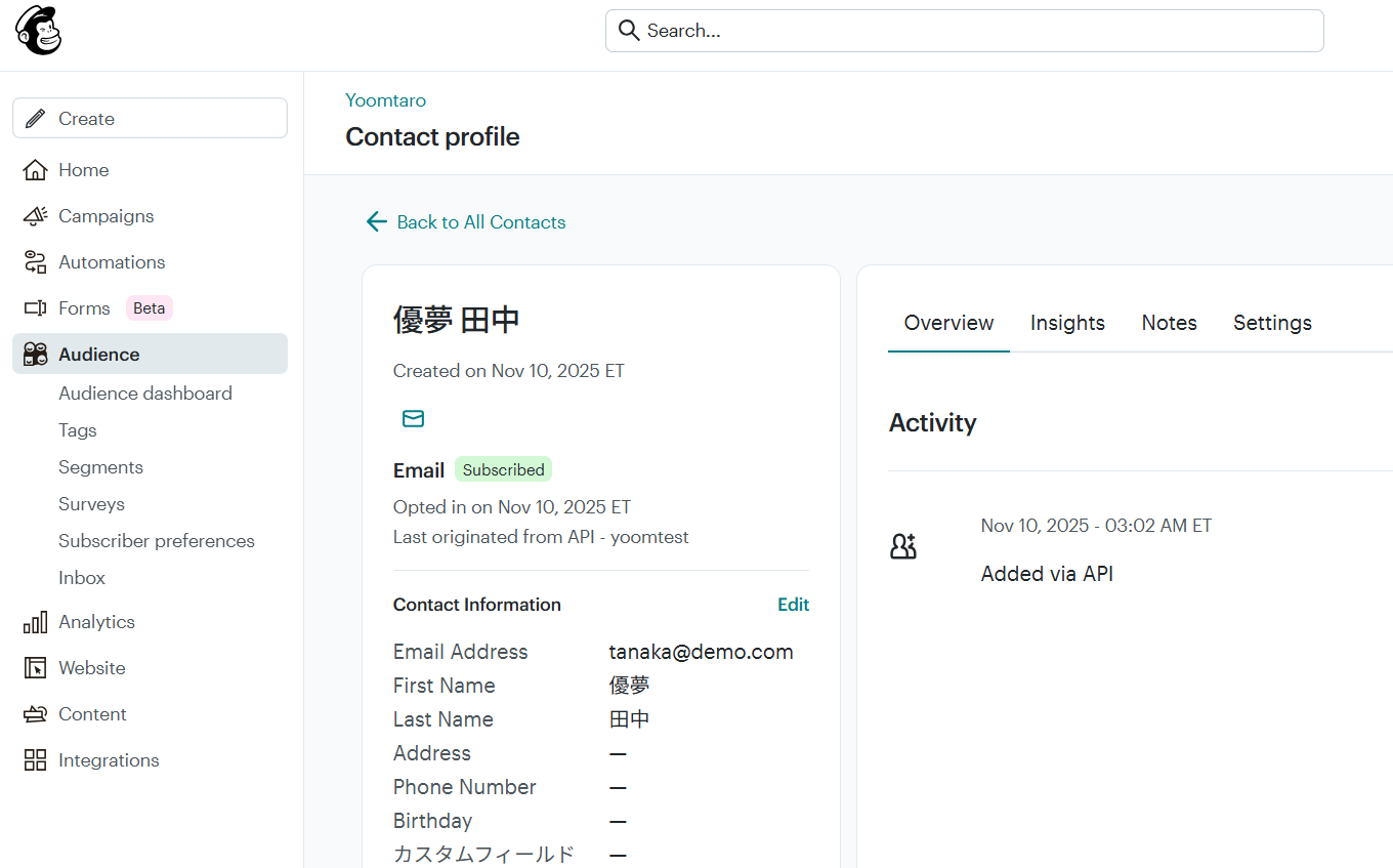 ・YouCanBookMe予定が入ると同時にMailchimpにリード情報が登録されるため、営業担当者はすぐにリードに対してアプローチすることができます。