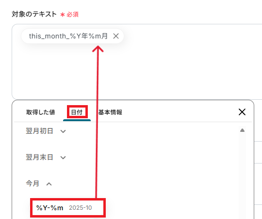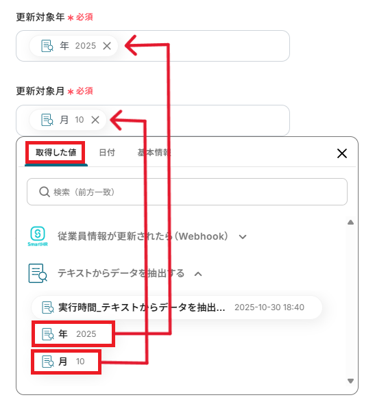 「更新対象年」と「更新対象月」はテキストから抽出した値を設定してください。