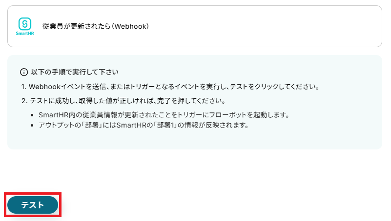 作成が完了したら、Yoomに戻り「テスト」を押してください。