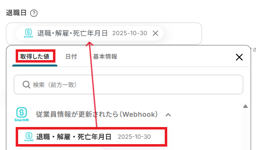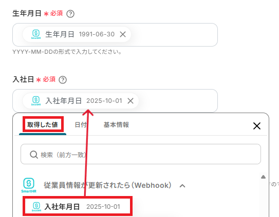 「生年月日」と「入社日」も、取得した値を活用し設定しましょう。