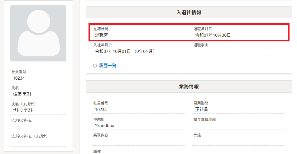 今回のテストでは【在籍中→退職済】の更新なので「退職日」を入力します。