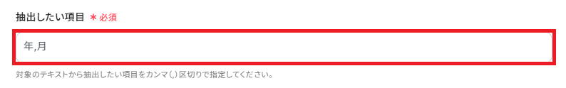 「抽出したい項目」は、テキストの中からどの項目を抽出するかを入力します。