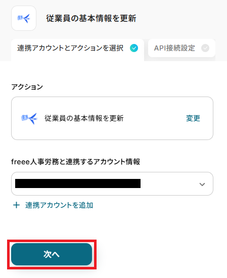 freee人事労務と連携するアカウントに間違いがないかを確認し、「次へ」をクリックしましょう。