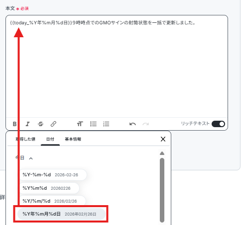 ※取得した値とは 設定時の「テスト」で取得した値のことです。後続ステップの入力値として利用でき、実行のたびに最新の内容に更新(変動)されます。