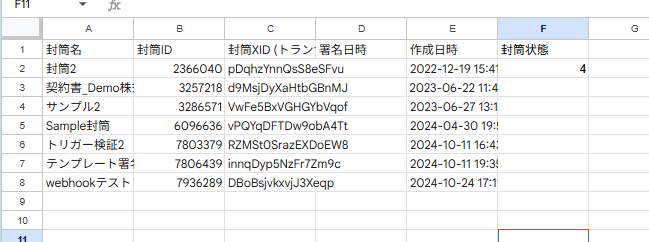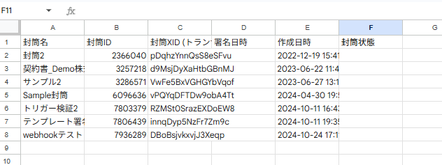 今回は、企業の法務部門がGMOサインで送付した書類の封筒状態を毎朝自動で確認し、Googleスプレッドシートに最新ステータスを記録するイメージとして、以下のようなGoogleスプレッドシートを準備しています。