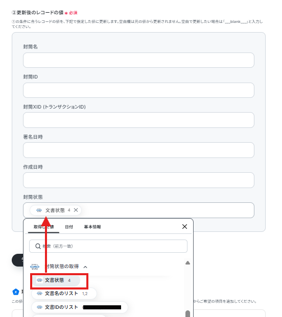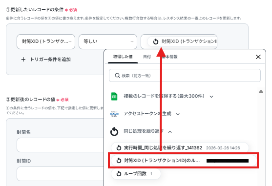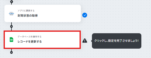 - ループ内で、GMOサインの「封筒状態の取得」とGoogle スプレッドシートの「レコードを更新する」を順に設定し、最新のステータスをシートに反映させます