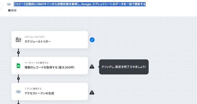 - スケジュールのトリガー設定とGMOサイン、Google スプレッドシートのアクション設定