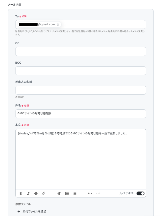 - メール機能では、通知先メールアドレスを任意で設定できるほか、件名や本文は自由にカスタマイズできます。