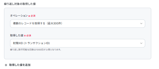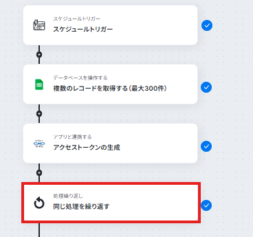 - 次に、繰り返し処理(ループ)機能を用いて、取得したレコード一件ずつに対して処理を繰り返すよう設定します