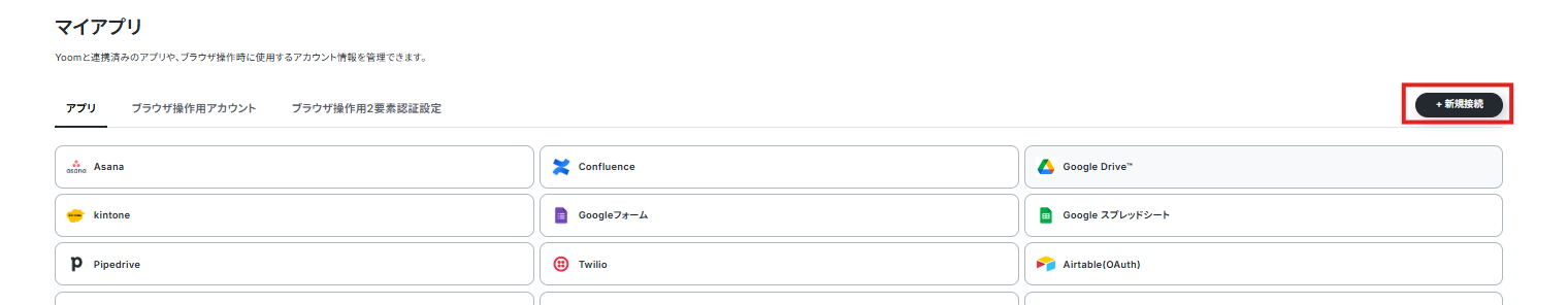 Yoomのアカウントにログインしたら「マイアプリ」をクリックし、「新規接続」を選択してください。