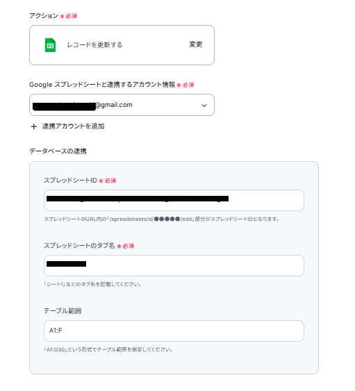 - Google スプレッドシートのオペレーションでは、対象としたい任意のスプレッドシートIDやシート(タブ)名などを設定してください