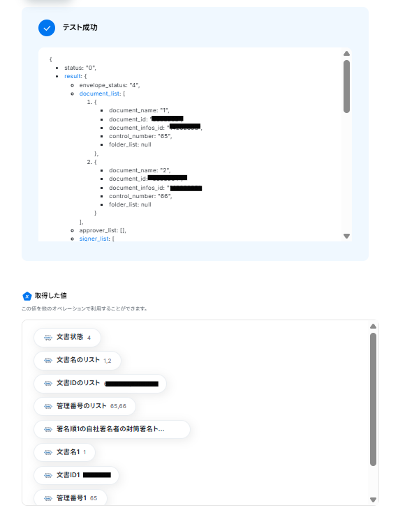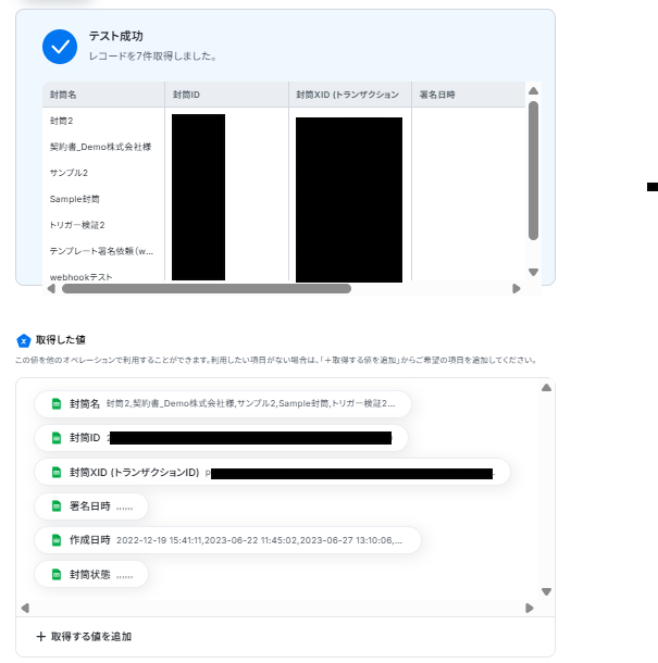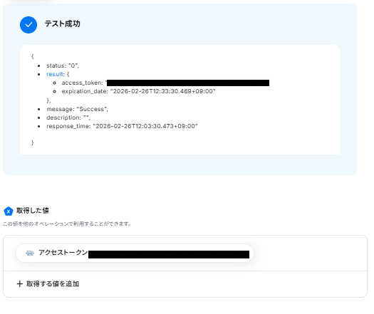 テストに成功すると、「取得した値」に情報が追加されます。