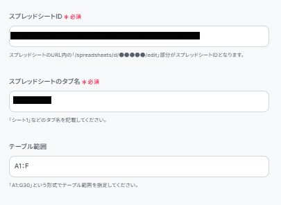 まず、スプレッドシートIDとスプレッドシートのタブ名を入力します。