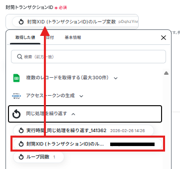 - ループ機能では、前段のGoogle スプレッドシートから取得した情報のうち、繰り返し処理を実行したい値を任意で設定できます