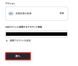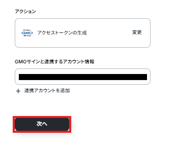 アクションは変更せず、アカウント情報がマイアプリ連携をしたアカウントと一致することを確認したら、「次へ」をクリック。