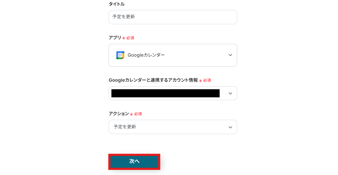 Googleカレンダーと連携するアカウント情報を設定します。 アクションは「予定を更新」を選択しましょう。 設定が終わったら「次へ」をクリックします。
