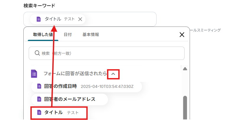 検索キーワード: タイトルやメールアドレスなどをキーワードとして設定できます。 以下のようにGoogleフォームのアウトプットを使用することもできます。 設定が終わったら「テスト」をクリックしましょう!