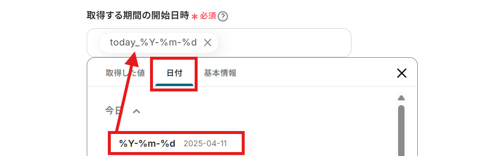 取得する期間の終了日時、取得する期間の開始日時: 日付の欄から設定できます。 例えば、以下の例では取得する期間の開始日時は今日になっています。