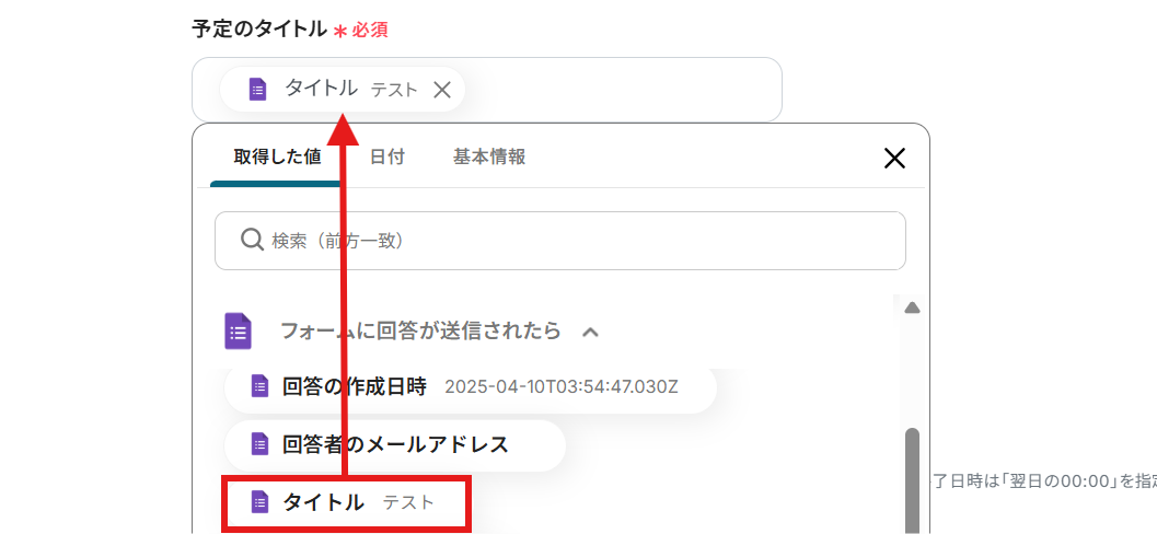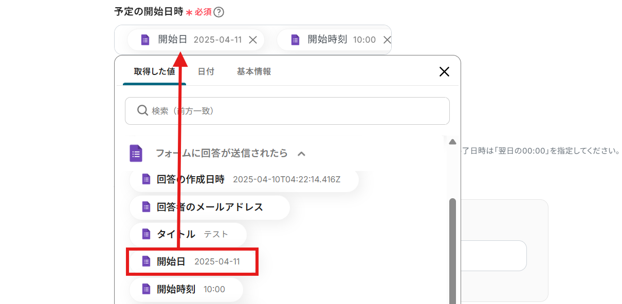 予定の開始日時、予定の終了日時: 予定のタイトルと同じように、Googleフォームから取得した情報を引用しましょう。 予定の開始日時なので、「開始日」「開始時刻」の両方を引用します。