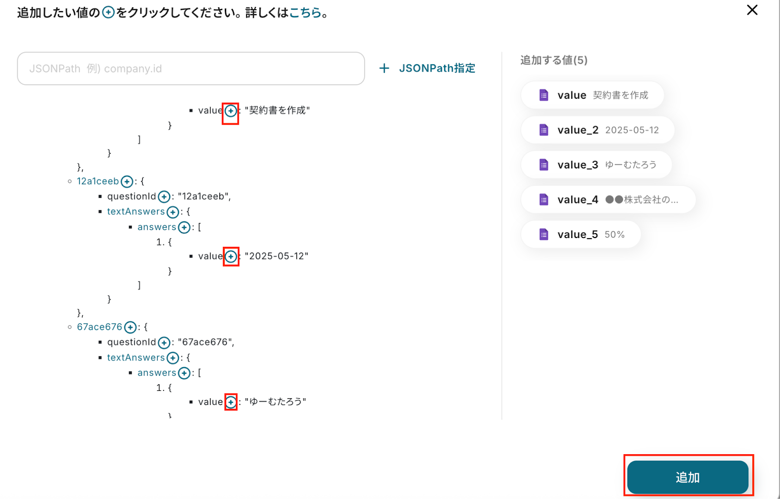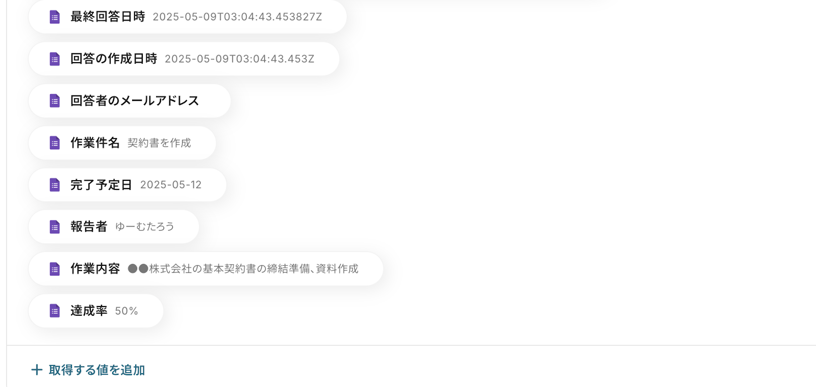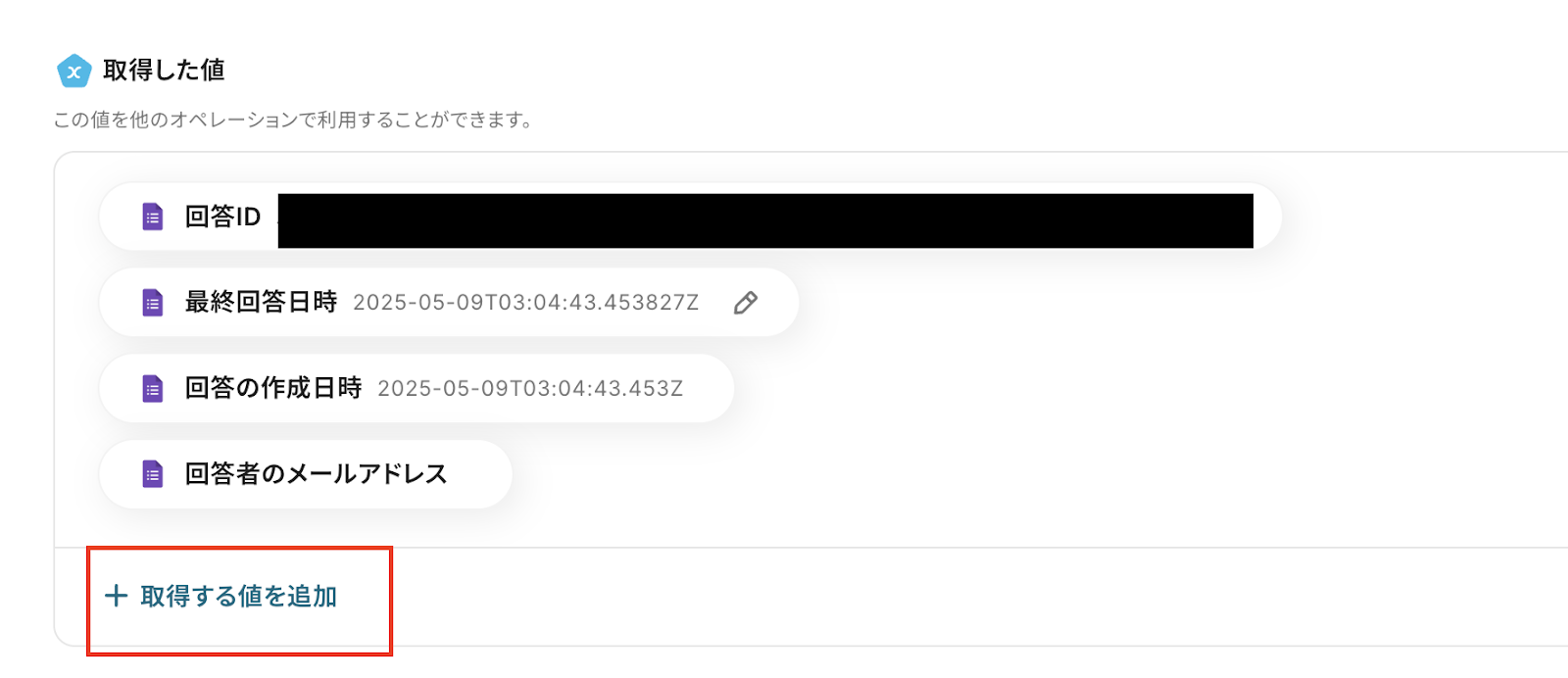 テストが成功したら、「取得する値を追加」をクリックして、手動でGoogleフォームの回答情報を追加する必要があります。