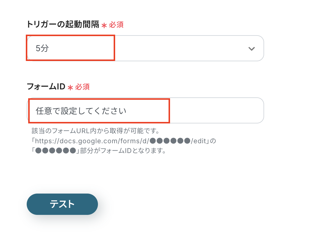設定後、トリガーアクション(フォームに回答が送信されたら)を実行し、テストをクリックしましょう。