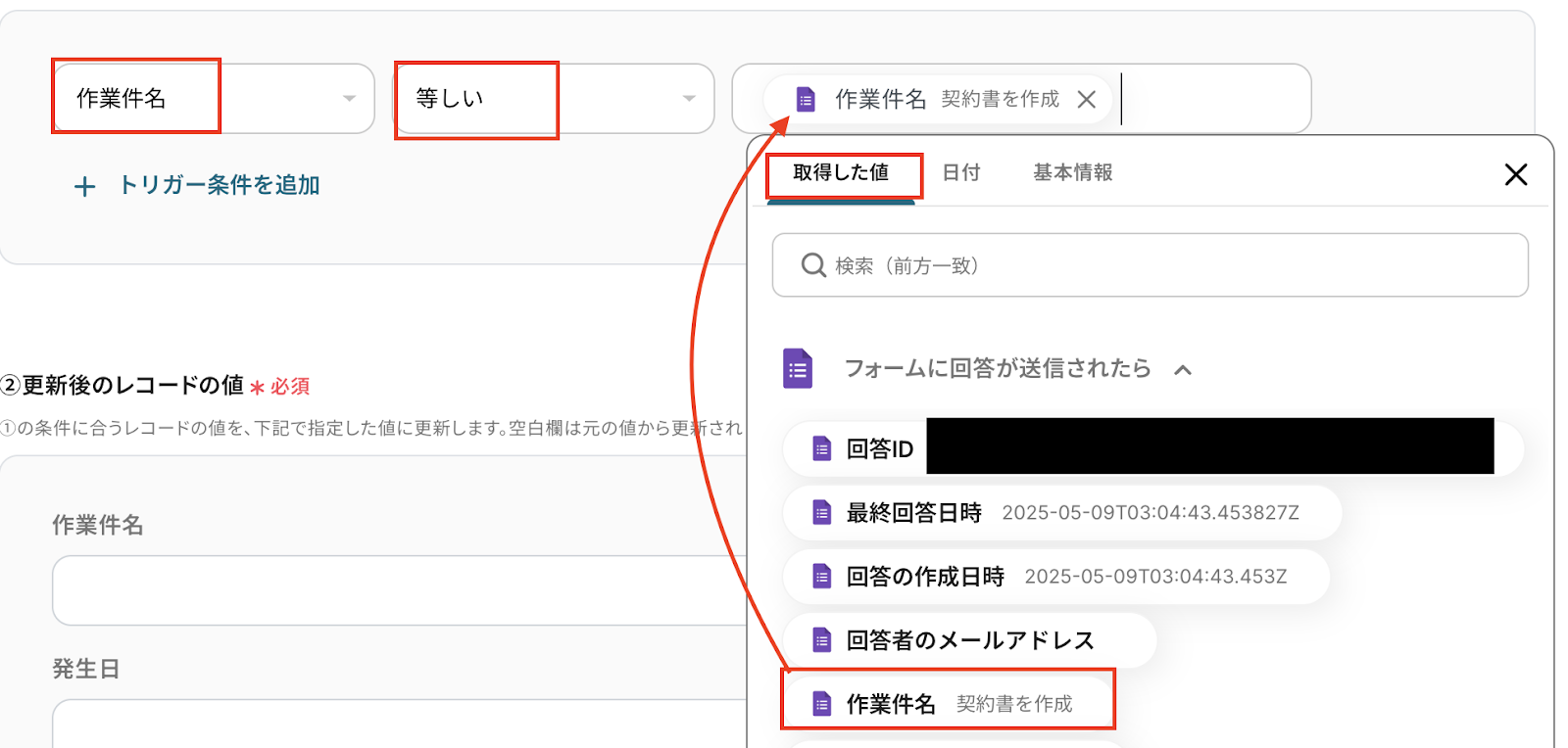 例えば作業件名は変更されない想定なので、「作業件名」「等しい」を選択し、Googleフォームの取得した値から「作業件名」をクリックします。