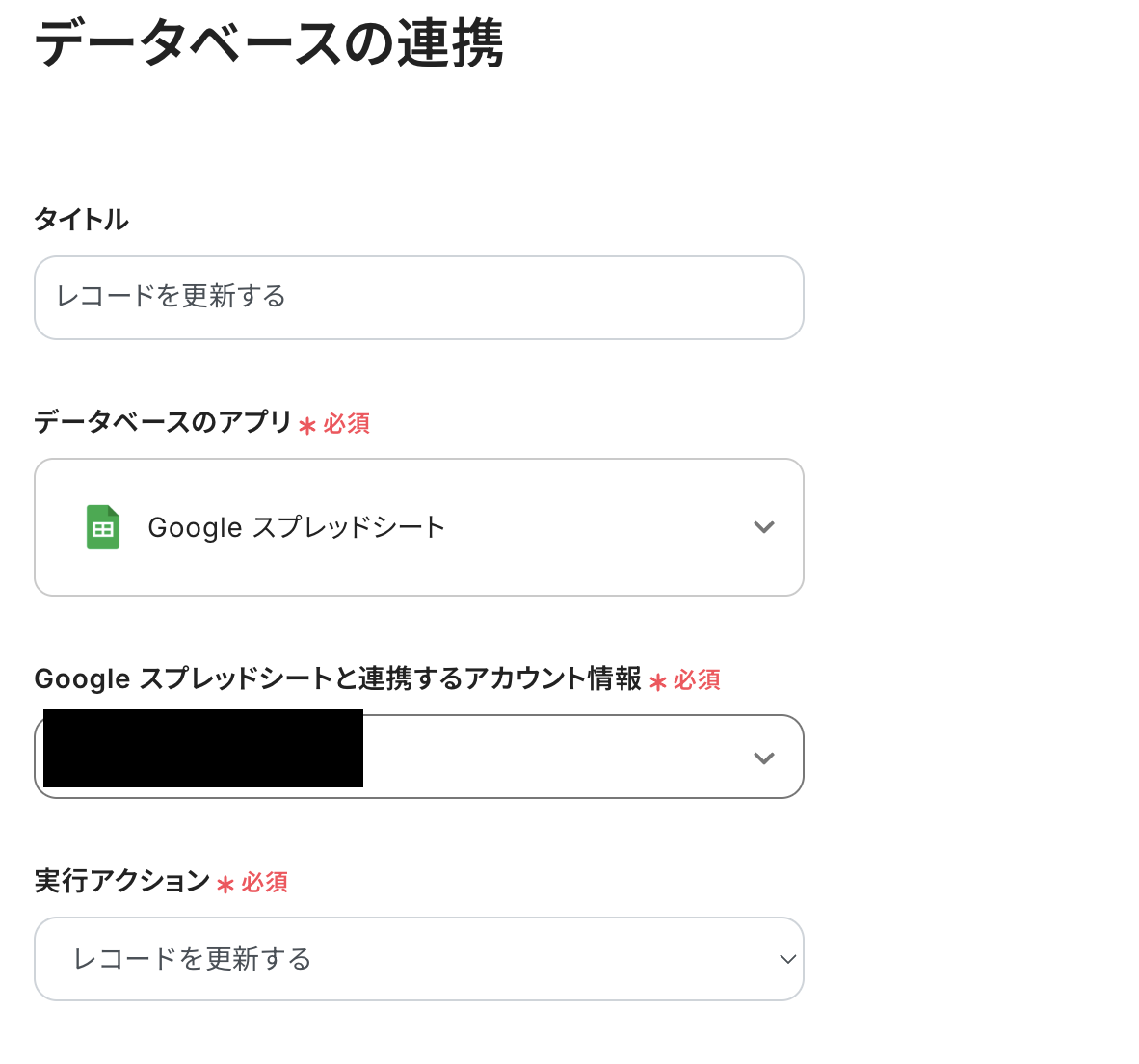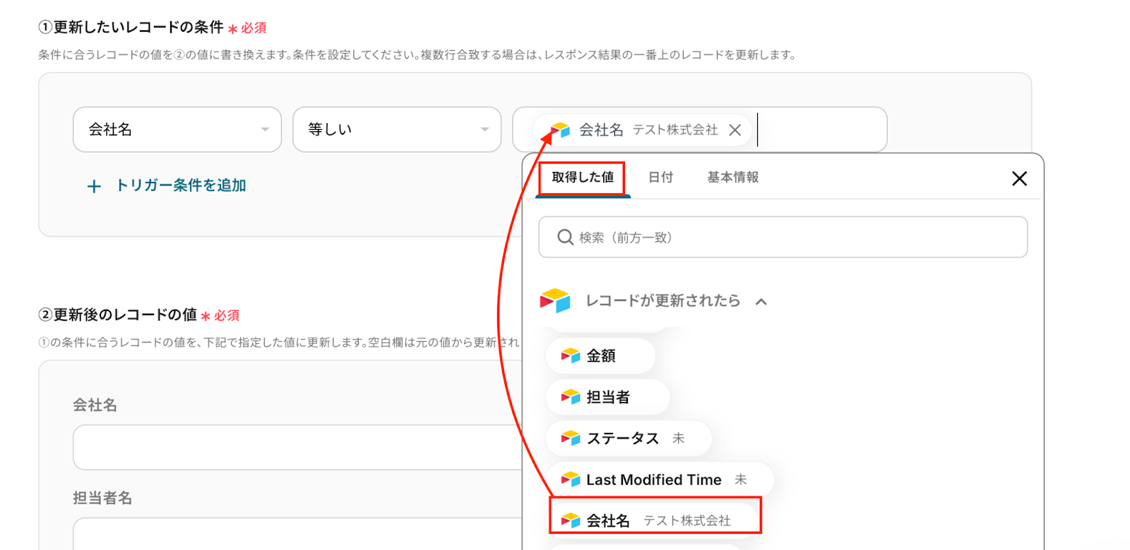 更新したいレコードの条件はGoogle スプレッドシートに登録されている会社名がAirtableの会社名と等しいレコード情報を更新するという設定にしています。
