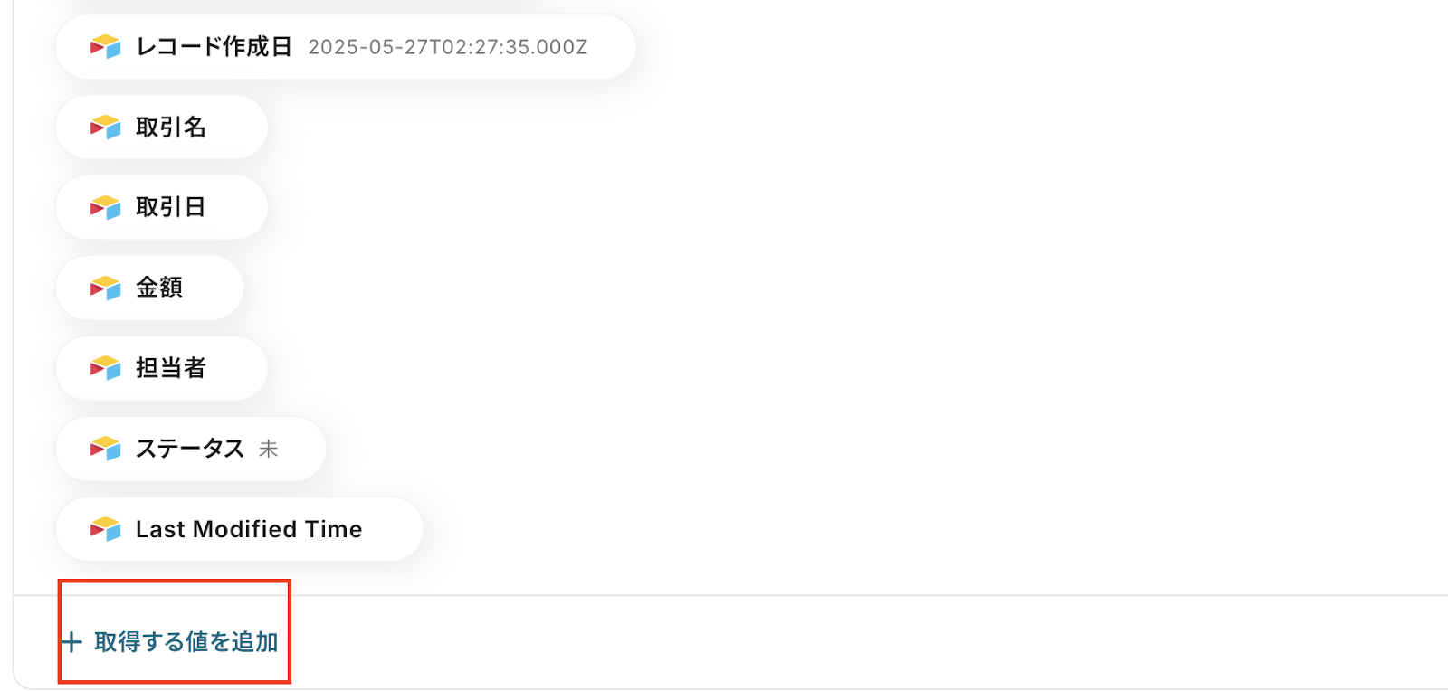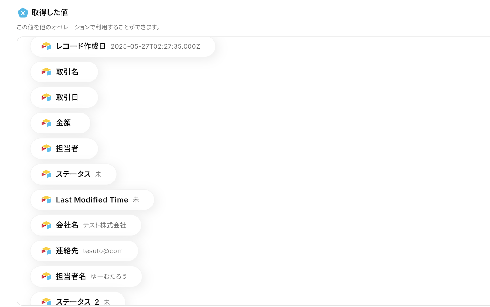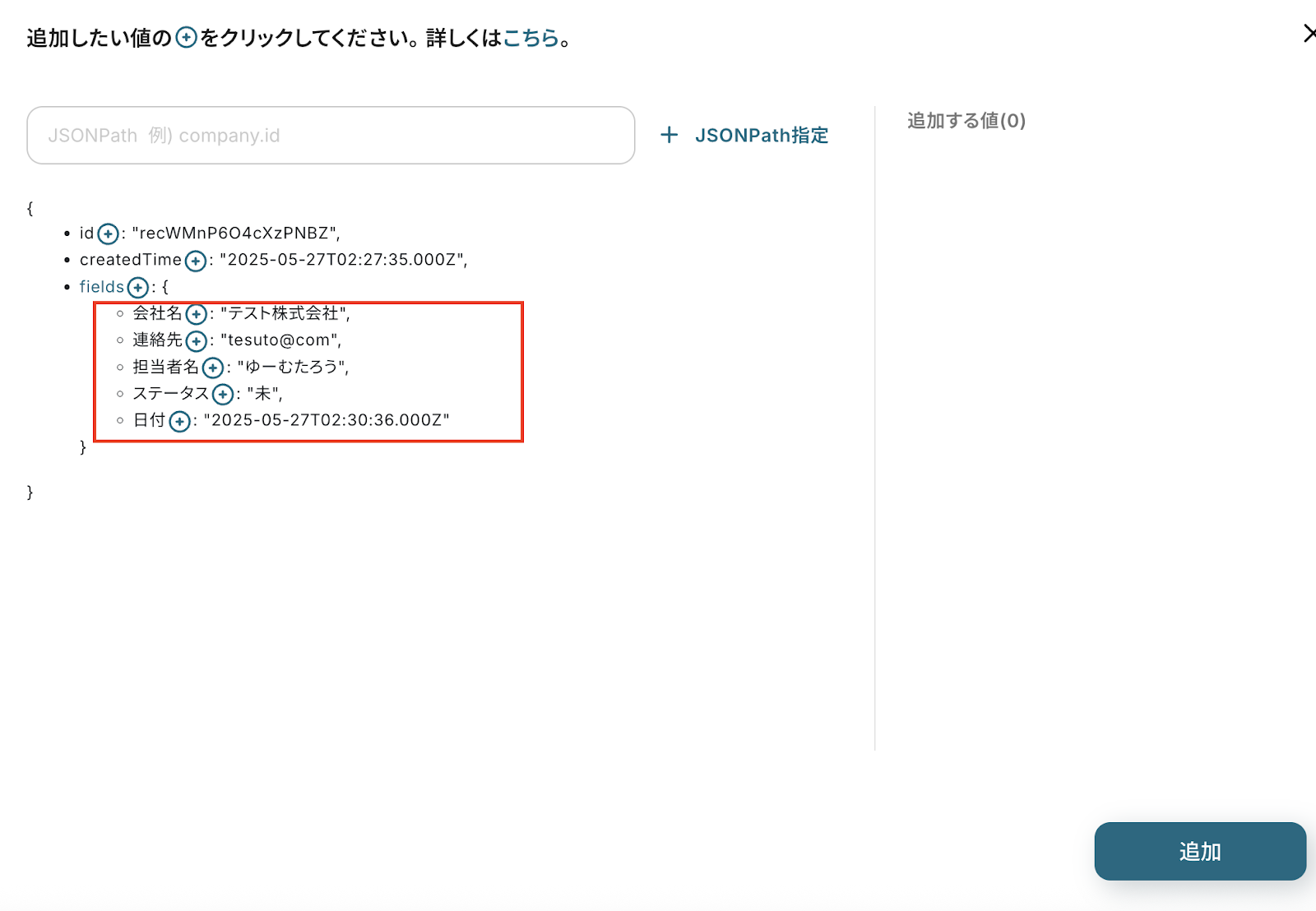 テストが成功したら、取得した値を追加をクリックし、Airtableの情報を手動で取得しましょう。