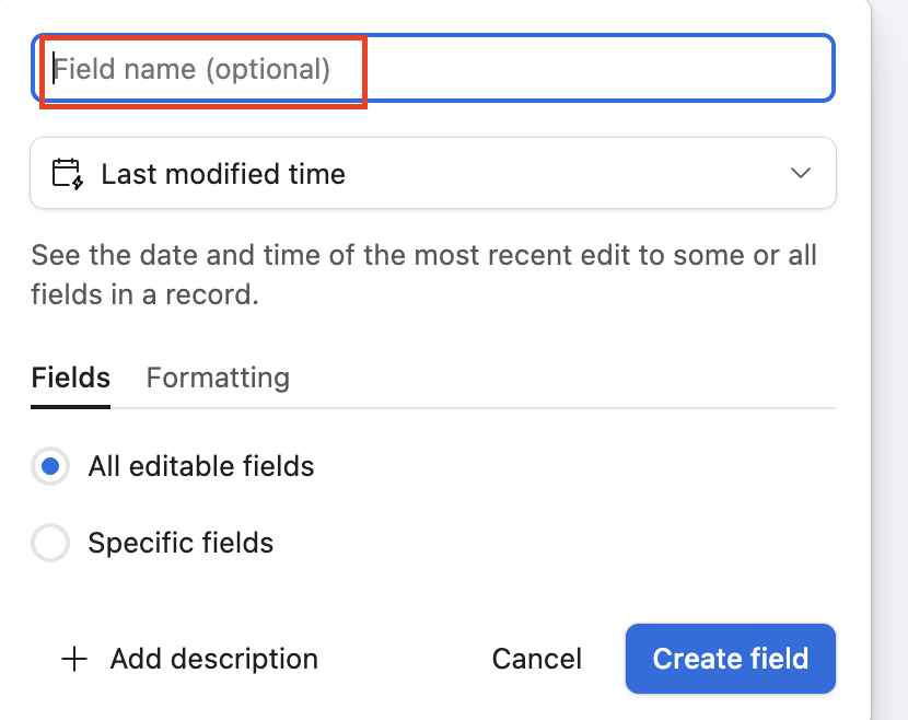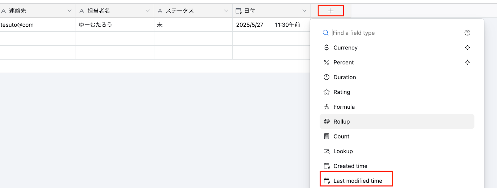 Last Modified Timeの設定は、Airtableのテーブルの右にある+ボタンをクリックし、Last Modified Timeを選択します。