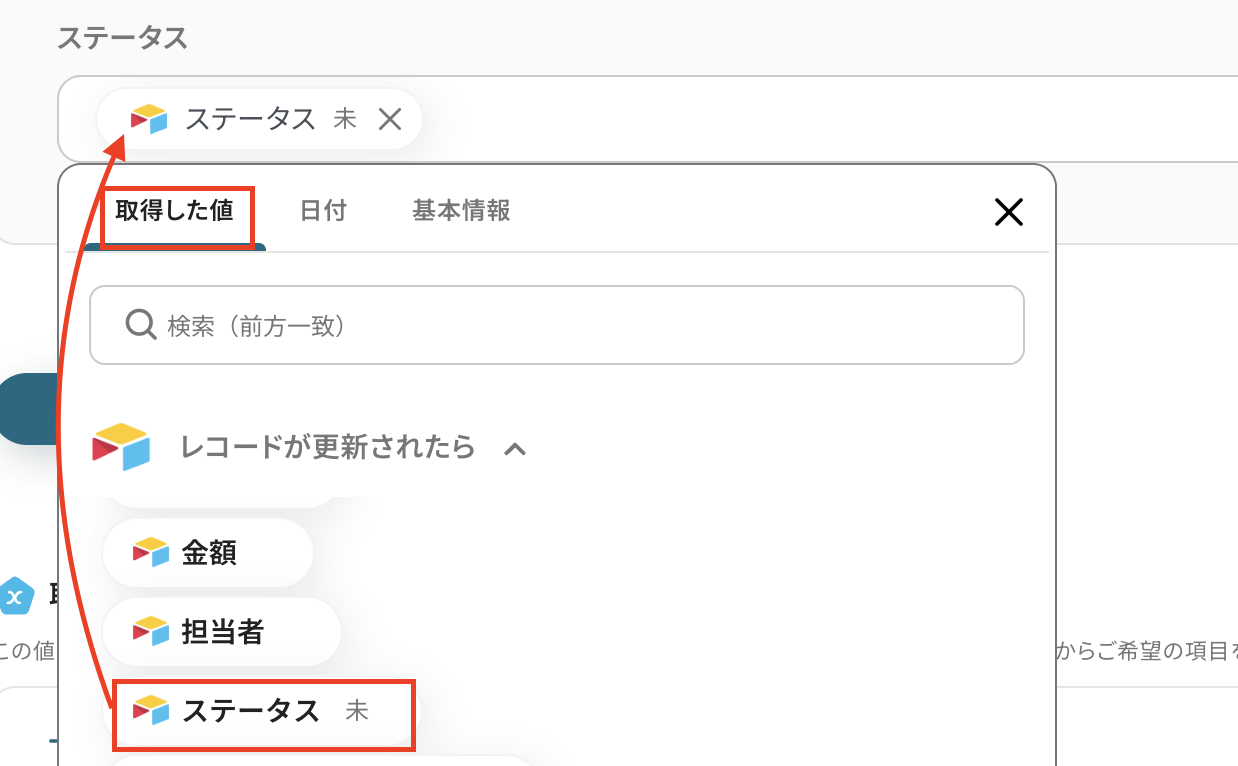 更新後のレコードの値はステータスを更新したいので、Airtableの取得した値から、ステータスを選択しましょう。