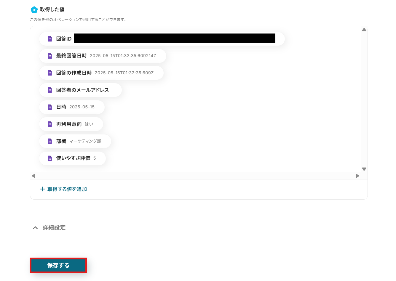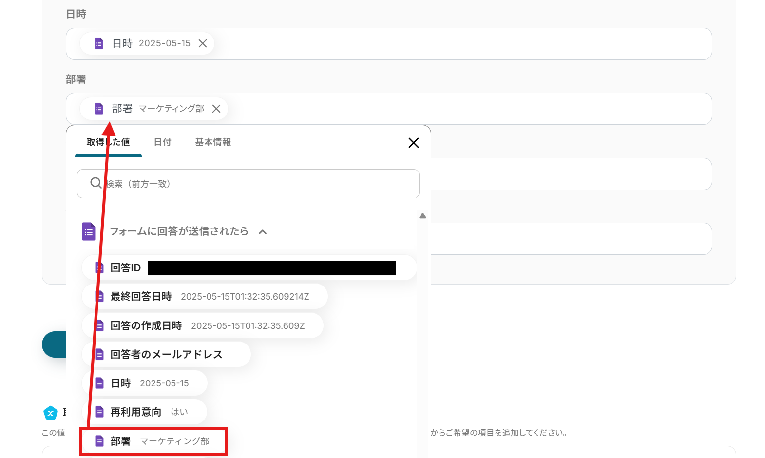 ・Googleフォームをトリガーとして使用した際の回答内容を取得する方法は下記をご参照ください。