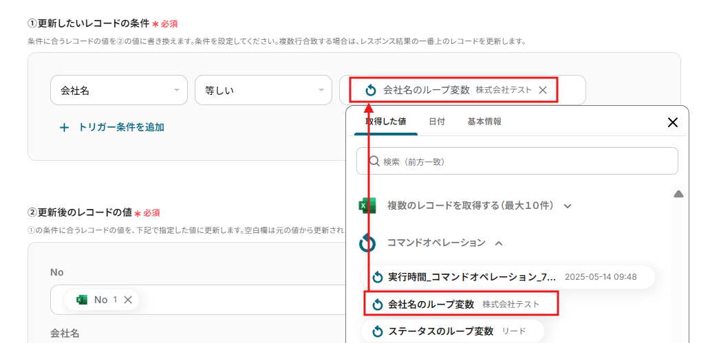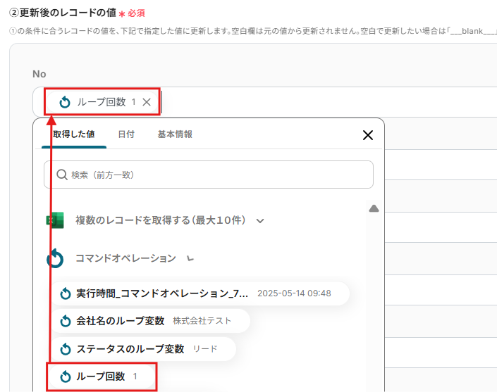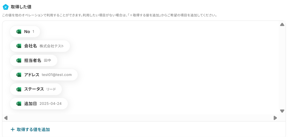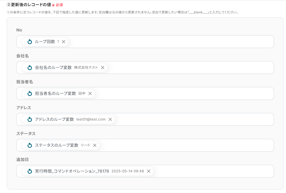 「会社名」「担当者名」「アドレス」「ステータス」「追加日」も、「No」同様に取得した値のループ変数から選択して入力してください。
