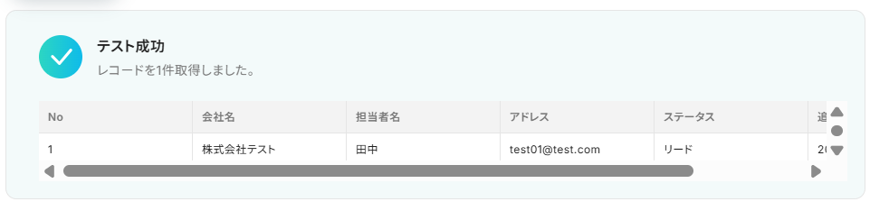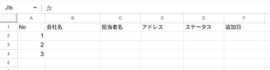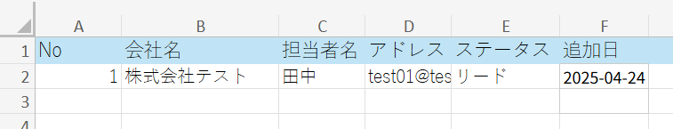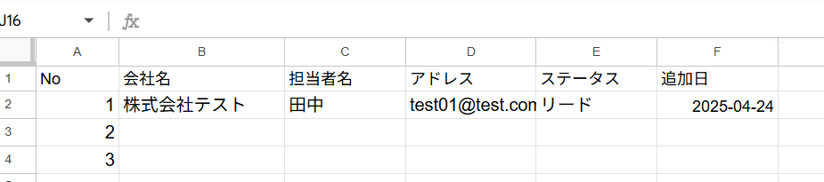 以下のように「会社名」「担当者名」「アドレス」「ステータス」「追加日」を入力してください。
