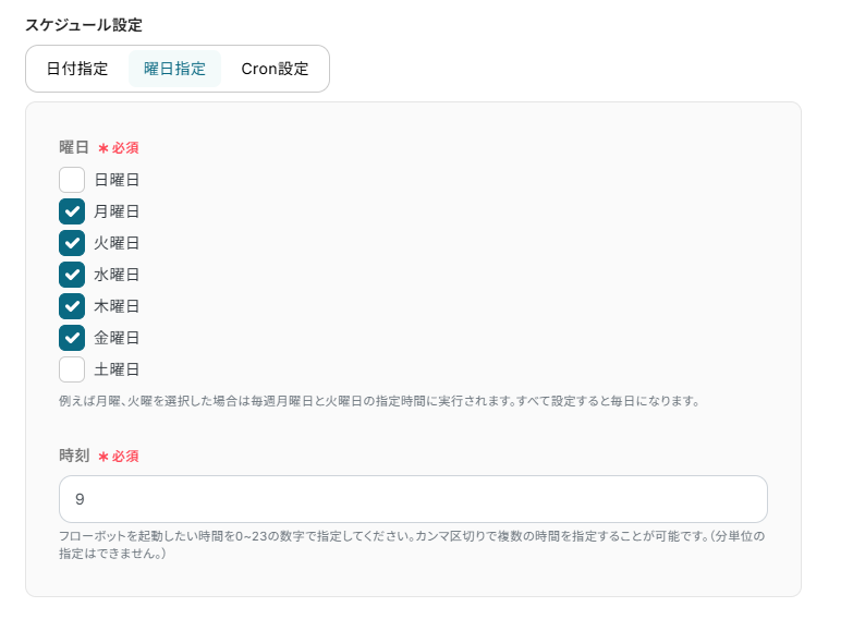 今回は、曜日指定で月~金曜日の9時に指定しました。日付指定も可能なため、月初や月末などに設定したい人は日付設定にしましょう。