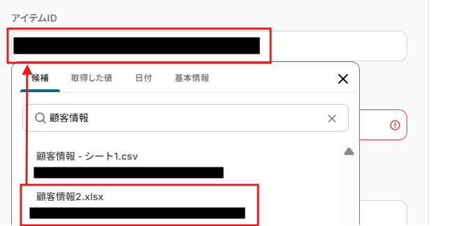 アイテムIDを候補から選択し、指定のMicrosoft Excelシートを指定しましょう。