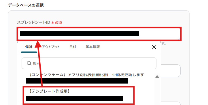 (3)「スプレッドシートID」にデータを更新したGoogle スプレッドシートのIDを入力します。 直接IDを入力することも可能ですが、「候補」に表示される連携したアカウントで開いたシートの一覧からも設定可能です。