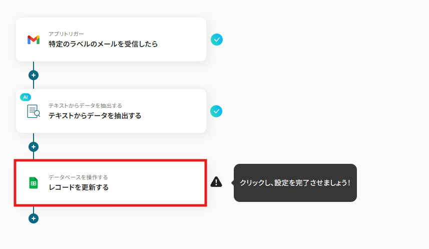 Gmailなどのメールアプリを起点に、Google スプレッドシートのデータを更新するフローです。メールアプリを開くことなくデータ転記が実現できます。