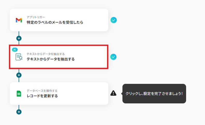 (1)次に、受信したメールの内容からテキストデータを抽出する設定を行います。 テンプレートの「テキストからデータを抽出する」をクリックしましょう。
