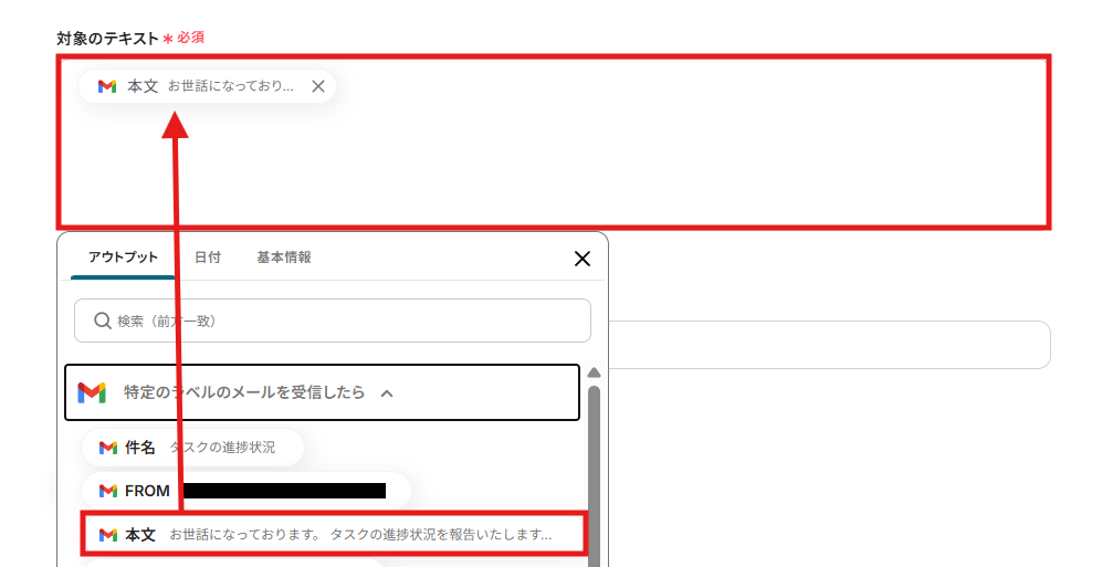 (3)「対象テキスト」にGmailから抽出したいメールの内容を設定します。 「アウトプット」の「特定のラベルのメールを受信したら」にある「本文」を選択しましょう。
