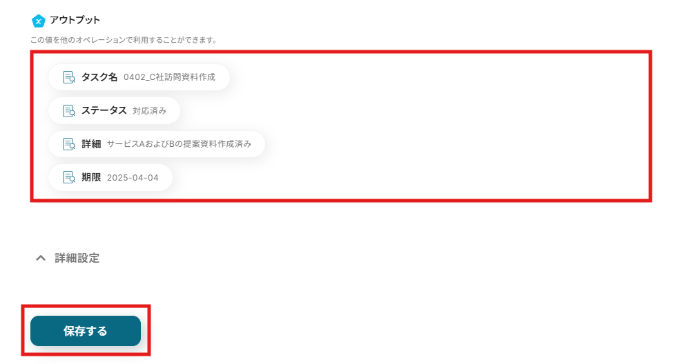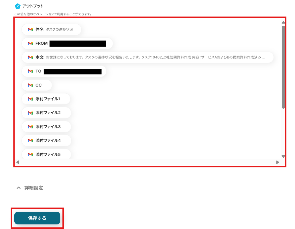 送信後に「テスト」をクリックし、「アウトプット」に送信したメールの内容やファイルが抽出されていることを確認しましょう。確認後、「保存する」をクリックして設定完了です。