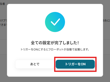 以上で、すべての設定が完了です。 設定の完了後は、以下のようなポップが表示されるのでトリガーをONにします。 実際にフローが正常に動作するかをチェックしてみましょう!