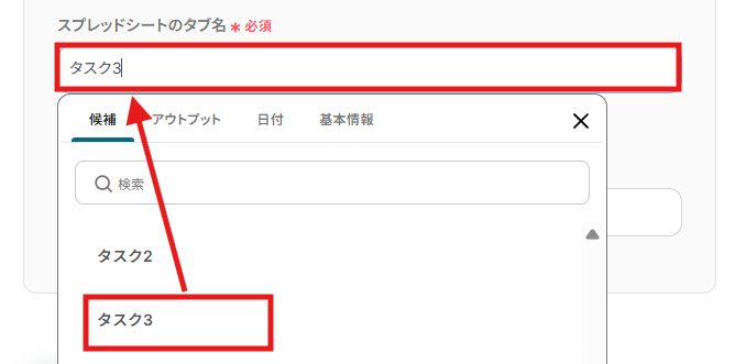 (4)「スプレッドシートのタブ名」に設定したシート内にある対象のタブ名を入力します。 「候補」に設定したシート内にあるタブのリストが表示されるので、対象のタブ名を選択しましょう。
