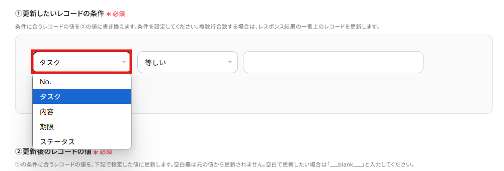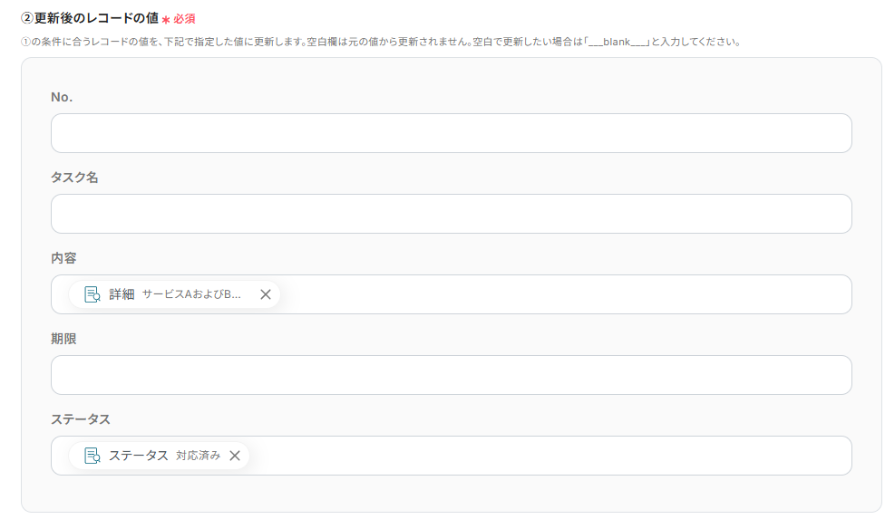 (8)次に、「更新後のレコードの値」を設定します。 入力欄を空白にした場合は、シート内にある元の値から更新されません。今回は、更新する必要がない「No.」「タスク名」「期限」の項目を空白にしています。