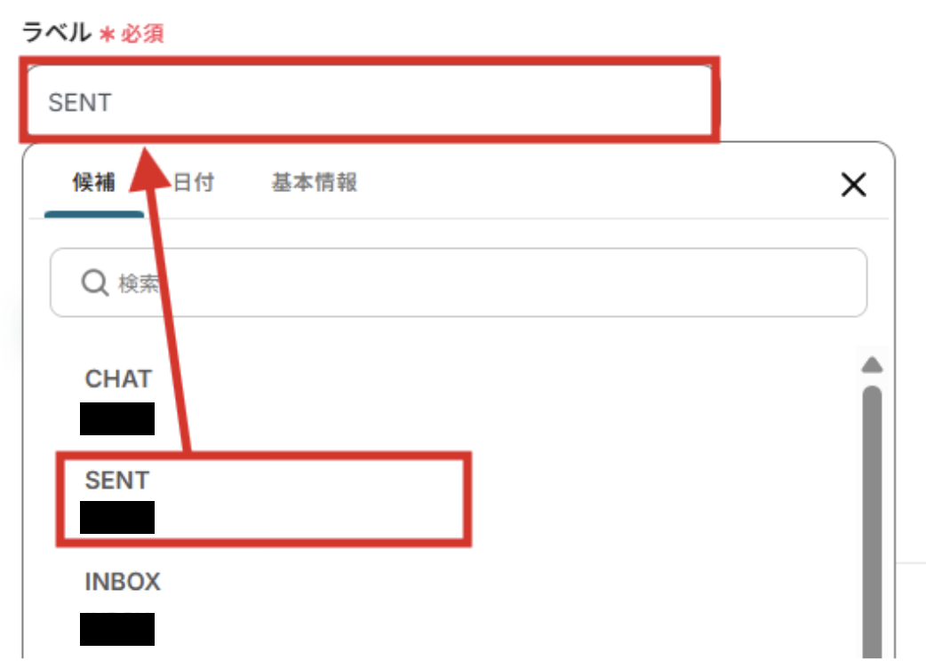 (4)「ラベル」欄に受信したいラベルを設定します。 入力欄をクリックすると、連携しているアカウントから候補が表示されます。フローの運用に使用したいラベルを、「候補」から選択しましょう。