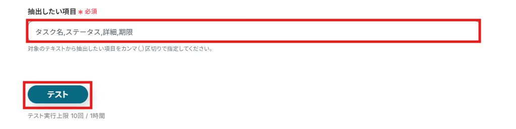 (4)「抽出したい項目」にメールから抽出したい項目をカンマ(,)区切りで設定します。 今回はタスクの進捗状況の報告を想定しているため、タスク名、ステータス、詳細、期限を設定しました。