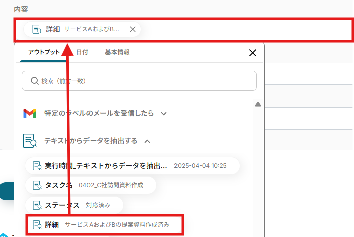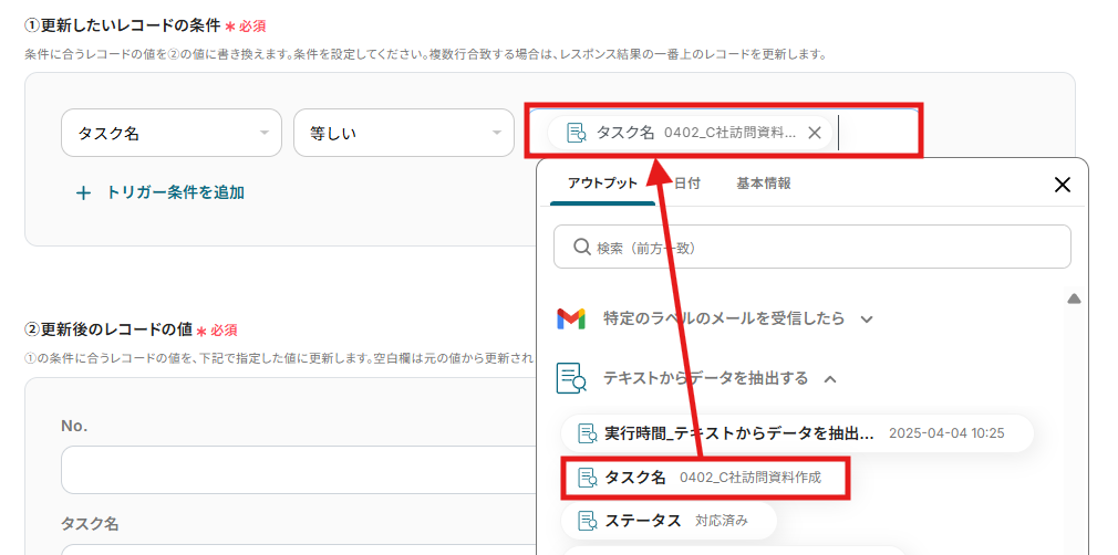 右のセルには、左のセルで設定した項目の条件に合うデータを選択しましょう。 今回は、「アウトプット」の「テキストからデータを抽出する」にある「タスク名」を選択します。