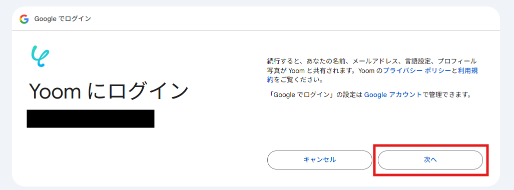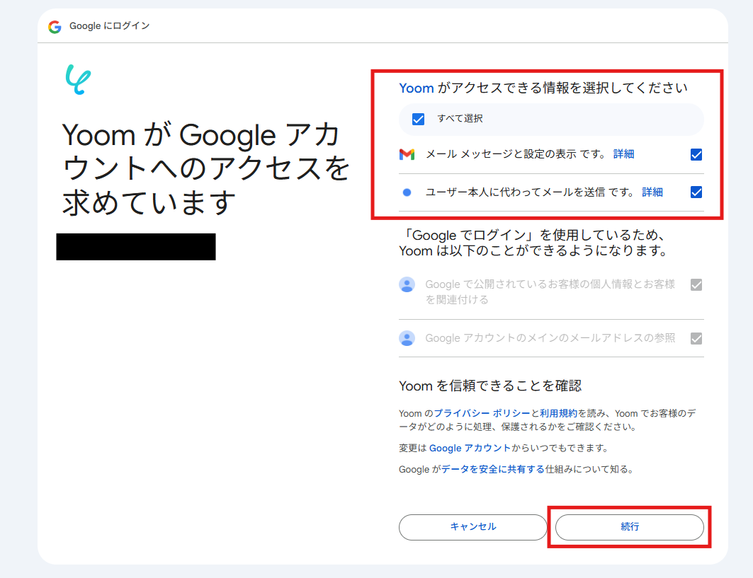 (4)「Yoomがアクセスできる情報を選択してください」の「すべて選択」をチェックし、「続行」をクリックします。