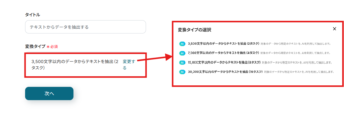 (2)抽出したいデータの変換タイプを選択します。 デフォルトでは3,500文字に設定されていますが、より長い文章のメールも抽出したい場合は、7,000文字以上を選択しましょう。